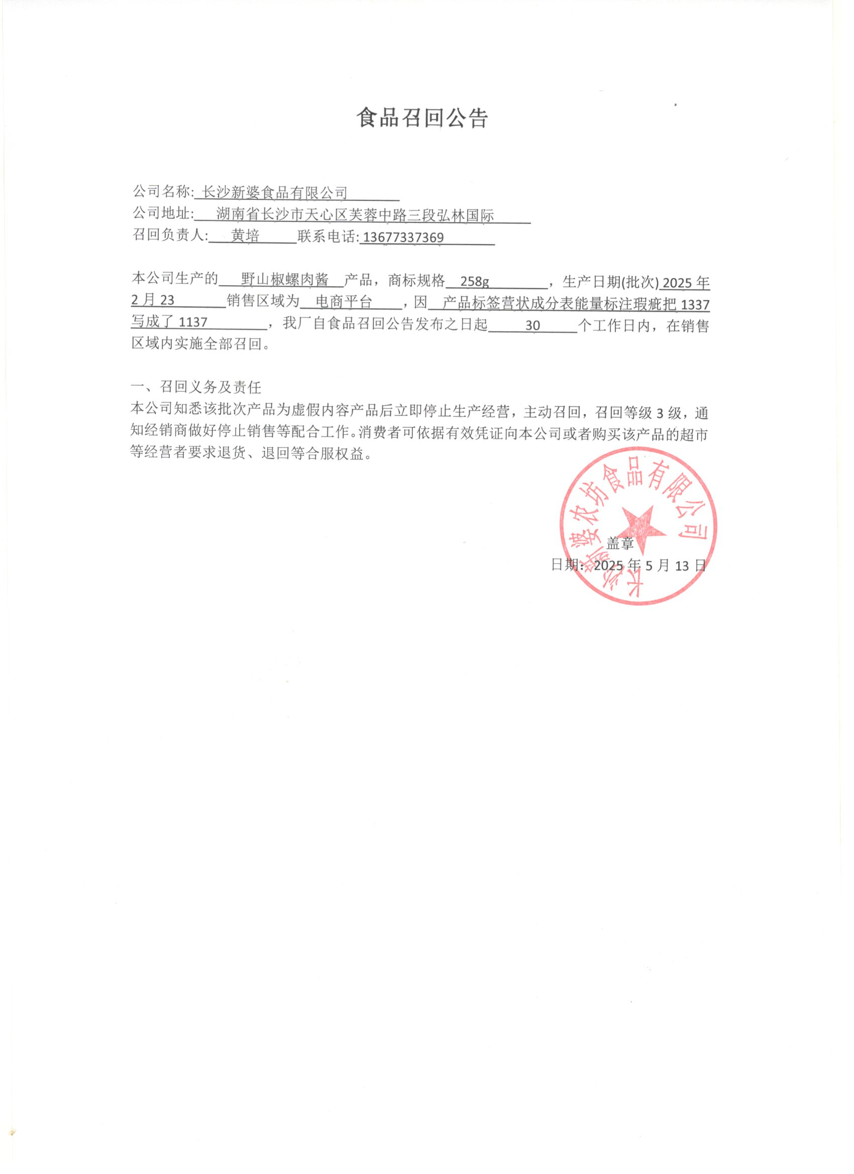 关于我司销售标签含有虚假内容的食品召回公告